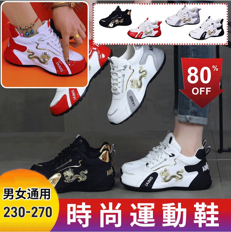「龍年春節定制款」男女通用刺綉龍運動鞋,5cm厚底立顯高挑,防滑設計,特質皮革耐磨抗折
