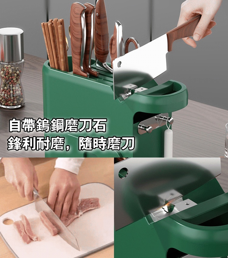 自带磨刀石/分區收納/瀝水盤 有了它,廚房再也不联亂! 一站式收納:磨刀區/刀具/勺筷筒/砧板區/挂钩區/瀝水區