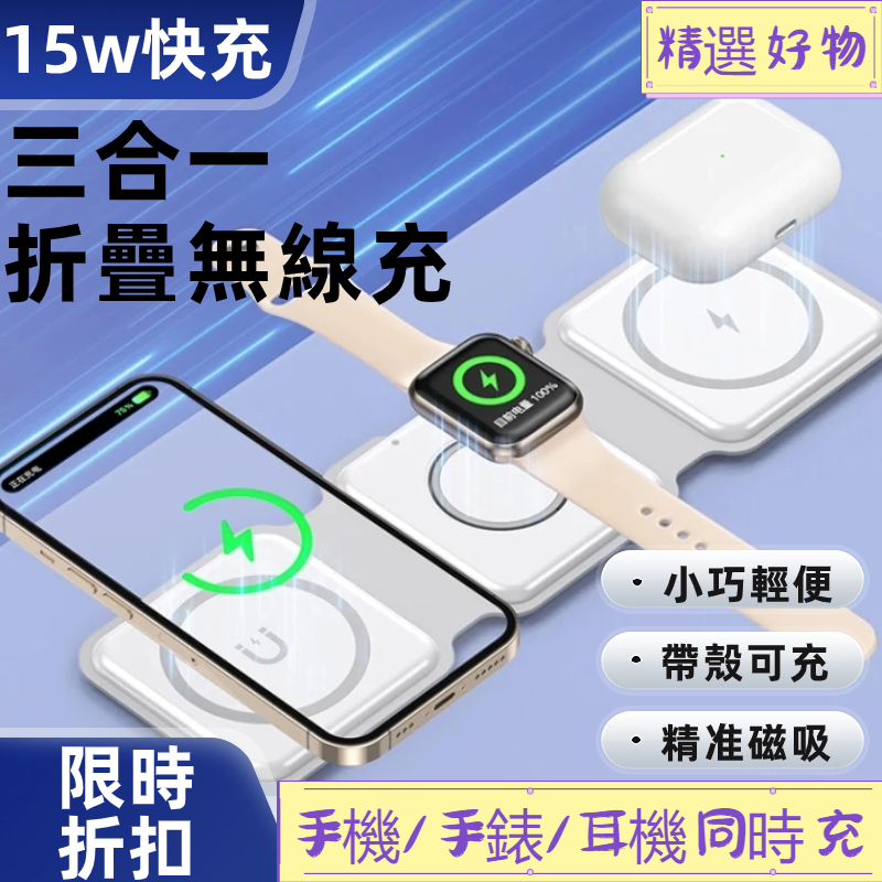 三合一折疊無線充!低溫快充不傷機!可以是三個設備同時充的無線充電器!也是手機支架!看劇充電兩不誤!精准磁吸不會掉!帶殼也能充哦!